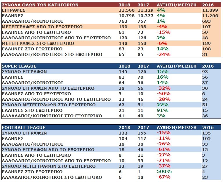 Αξίζει να αναφέρουμε ότι για τα στοιχεία που μπορείτε να δείτε στη στήλη των φωτογραφιών δεξιά, η ΕΠΟ σημειώνει: «Τα στοιχεία προηγούμενων ετών που παρατίθενται στους πίνακες, αφορούν τις ευθέως αντίστοιχες μετεγγραφικές περιόδους, δηλαδή τις χειμερινές του 2017 και 2016.