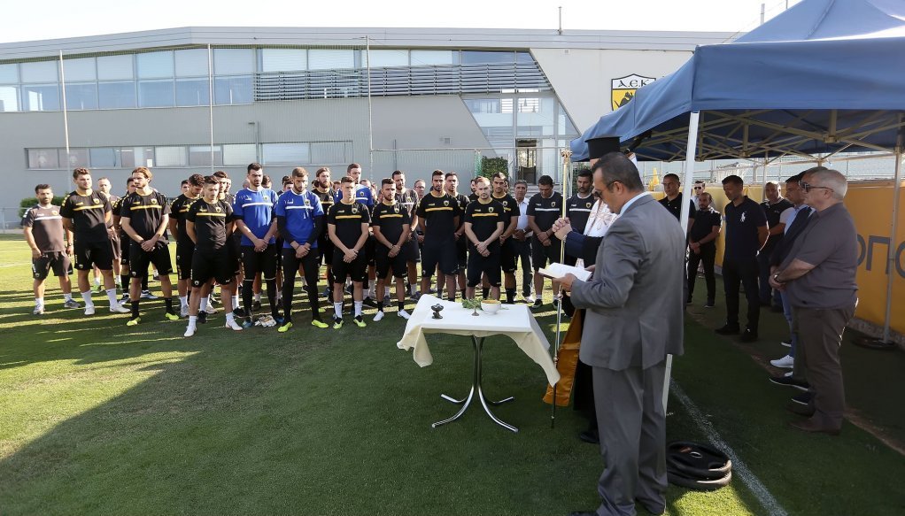 Την ευλογία του Θεού πήραν το απόγευμα της Πέμπτης (30/8) οι ποδοσφαιριστές της ΑΕΚ, αφού, παρουσία Δημήτρη Μελισσανίδη, πραγματοποιήθηκε στο προπονητικό κέντρο των Σπάτων ο αγιασμός για τη νέα σεζόν.