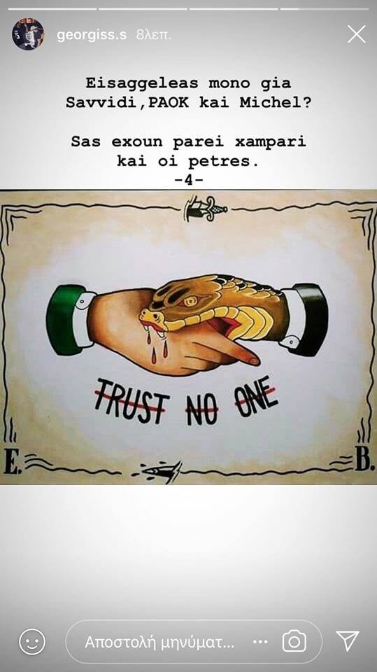 «Εισαγγελέας μόνο για Σαββίδη, ΠΑΟΚ και Μίχελ; Σας έχουν πάρει χαμπάρι και οι πέτρες», έγραψε χαρακτηριστικά στο Instagram, βάζοντας μια φωτογραφία χειραψίας, που το ένα χέρι είναι φίδι.