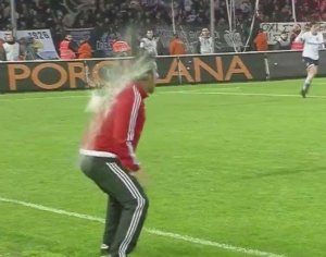Συγκεκριμένα, δύο λεπτά μετά το γκολ του Νταβίντ Φουστέρ (59’), ένας οπαδός πέταξε ένα γεμάτο ποτήρι (μάλλον με νερό) προς τον «ερυθρόλευκο» πάγκο.