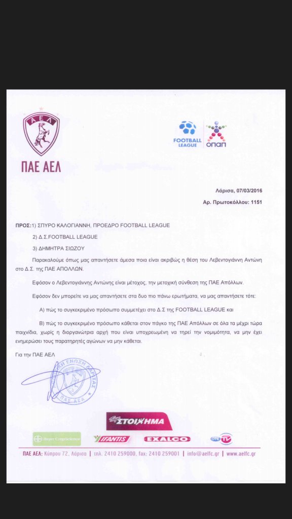 Παρακαλούμε όπως μας απαντήσετε άμεσα ποια είναι ακριβώς η θέση του Λεβεντογιάννη Αντώνη στο ΔΣ της ΠΑΕ Απόλλων.
