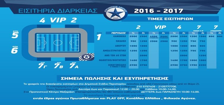 Αναλυτικά: «Το Τμήμα Διαχείρισης Εισιτηρίων της ΠΑΕ Ατρόμητος ενημερώνει τους φιλάθλους της ομάδας μας για τις μεγάλες προσφορές που ισχύουν κατά την Α’ περίοδο πώλησης των Εισιτηρίων Διαρκείας 2016/17 και τους καλεί να επωφεληθούν μέχρι τις 16 Ιουλίου καθώς: