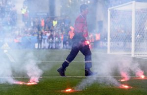 Το αποτέλεσμα ήταν υπάρξει πεντάλεπτη διακοπή και μεταξύ άλλων να τραυματιστεί ένας σεκιούριτι, δίπλα στον οποίο έσκασε κροτίδα κι ενώ εκείνος προσπαθούσε να καθαρίσει τον αγωνιστικό χώρο.
