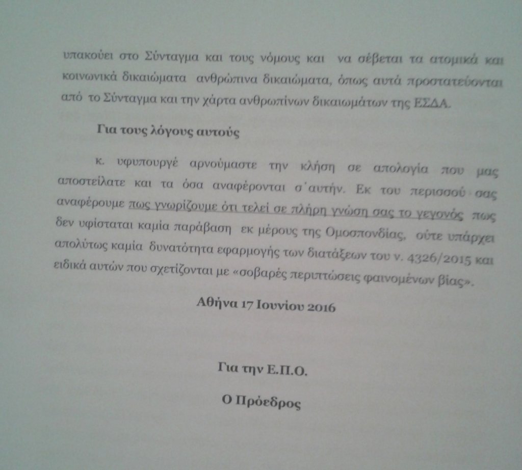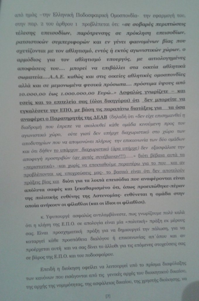 Μάλιστα, η ΕΠΟ στο κλείσιμο του υπομνήματός της προς τον Κοντονή αναφέρει τα ακόλουθα: «Κύριε υφυπουργέ αρνούμαστε την κλήση μας σε απολογία που μας αποστείλετε και τα όσα αναφέρονται σ’ αυτήν. Εκ του περισσού σας αναφέρουμε πως γνωρίζουμε ότι τελεί σε πλήρη γνώση σας το γεγονός πως δεν υφίσταται καμία παράβαση εκ μέρους της Ομοσπονδίας, ούτε υπάρχει καμία δυνατότητα εφαρμογής των διατάξεων του ν. 4326/2015 και ειδικά αυτών που σχετίζονται με ‘‘σοβαρές περιπτώσεις φαινομένων βίας’’».