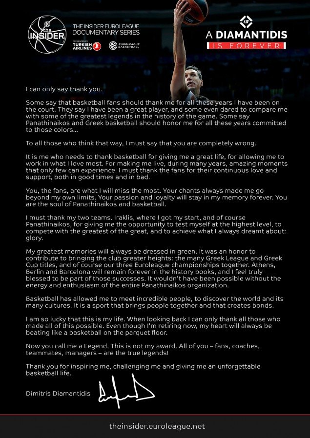Εσείς, οι φίλαθλοι, είστε αυτό που θα μου λείψει πιο πολύ. Οι φωνές σας πάντα με έκαναν να ξεπεράσω τα όριά μου. Το πάθος και η αφοσίωσή σας θα μείνουν για πάντα στη μνήμη μου. Είστε η ψυχή του Παναθηναϊκού και του μπάσκετ.