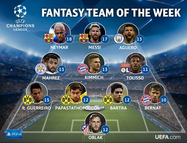 Οι τρεις κορυφαίοι μέσοι ήταν οι Μαχρέζ (Λέστερ), Κίμιχ (Μπάγερν) και Τολίσο (Λυών). Την επιθετική τριάδα αποτελούν οι Νεϊμάρ και Μέσι από την Μπαρτσελόνα αλλά και ο Αγκουέρο της Μάντσεστερ Σίτι.
