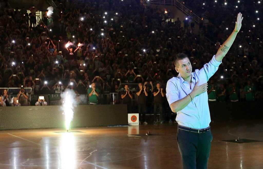 «Καλησπέρα σε όλους. Τελικά είναι πιο εύκολο να φεύγεις παρά να κρατάς μικρόφωνο. Σας ευχαριστώ όλους για όλα αυτά τα χρόνια που ήμουν εδώ, για τη στήριξή σας, για την αγάπη σας. Θέλω να ευχαριστήσω την ΚΑΕ Παναθηναϊκός. Για την τιμή των τριών τελευταίων ημερών, και να ευχαριστήσω την οικογένεια Γιαννακόπουλου, τον κύριο Παύλο, τον κύριο Θανάση, τον κύριο Δημήτρη και τον κύριο Κώστα.