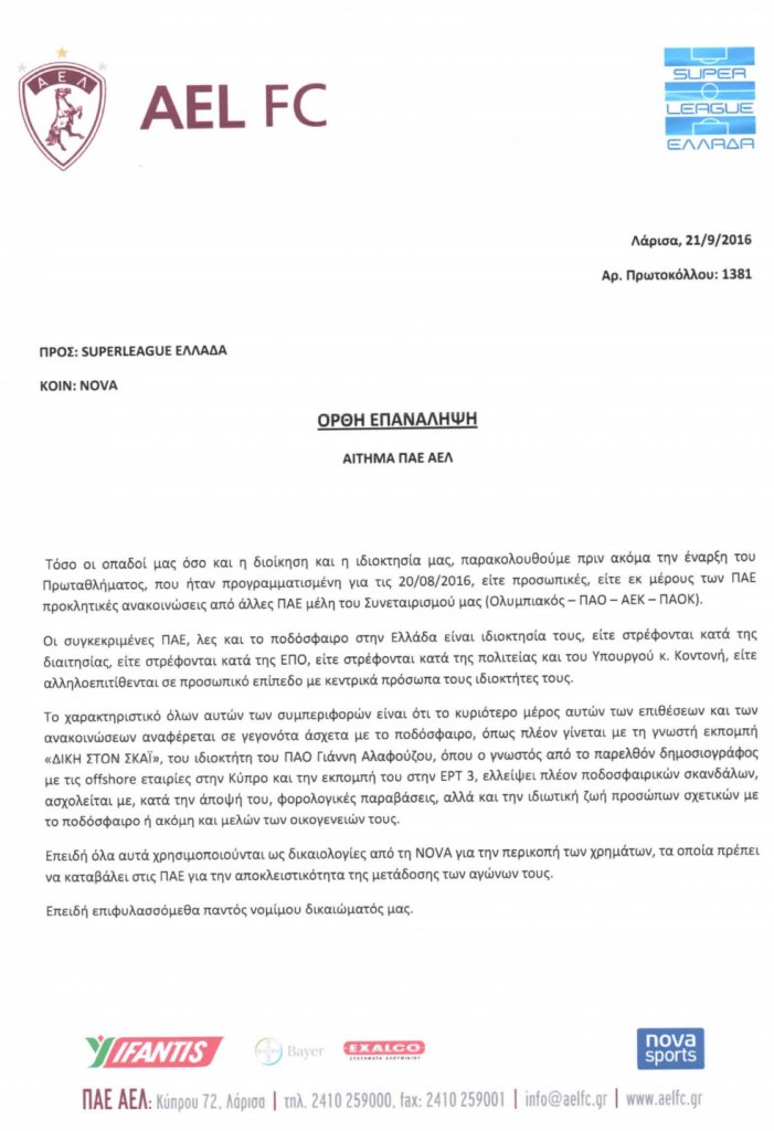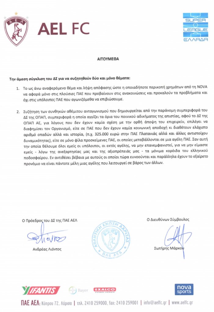 Σε μία σοβαρή κίνηση προχώρησε η ΑΕΛ, η οποία έχει εκφράσει ουκ ολίγες φορές από τη στιγμή που ανέβηκε ξανά στη Σούπερ Λίγκα τις ανησυχίες της για το προϊόν και το πώς αντιμετωπίζονται οι ομάδες πλην των τεσσάρων μεγάλων.