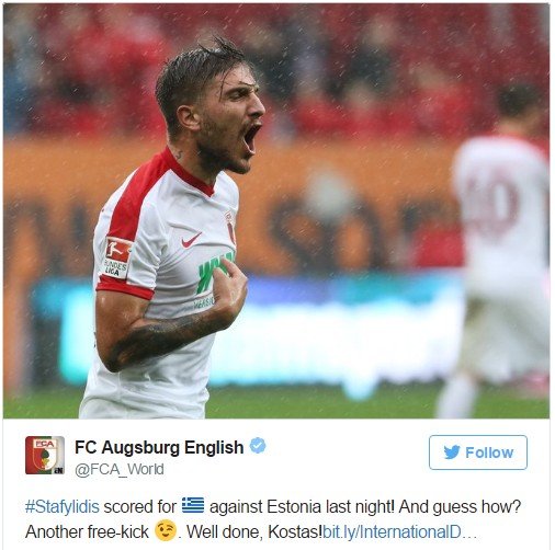 «Ο Σταφυλίδης πέτυχε το πρώτο του γκολ με την εθνική Ελλάδας και μαντέψτε πως το έκανε... Με εκτέλεση φάουλ! Συγχαρητήρια Κώστα», ήταν το μήνυμα της Άουγκσμπουργκ.