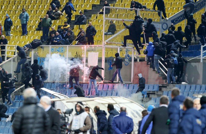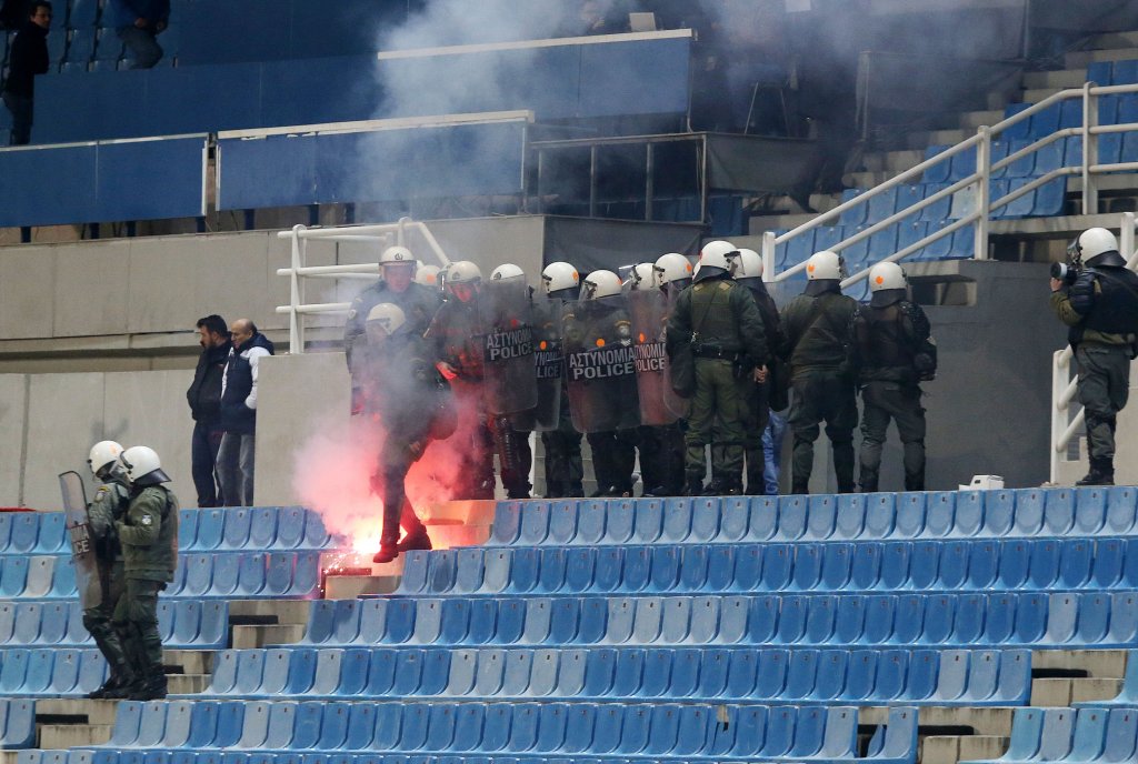 Υπήρξαν συμπλοκές στις κερκίδες με τις δυνάμεις των ΜΑΤ, οι οποίες έκαναν χρήση δακρυγόνων.