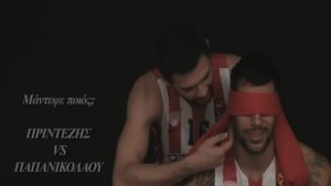 Ένας εκ των καλαθοσφαιριστών των Πειραιωτών κάθεται σε μια καρέκλα με δεμένα τα μάτια και προσπαθεί να βρει ποιος είναι εκείνος που τον... πειράζει.