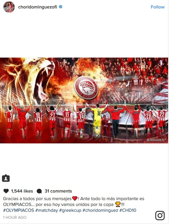 Αναλυτικά το μήνυμά του: «Σας ευχαριστώ όλους για τα μηνύματά σας! Πρώτα απ' όλα ότο πιο σημαντικό πράγμα είναι ο ΟΛΥΜΠΙΑΚΟΣ... Γι' αυτό απόψε είμαστε ενωμένοι για το κύπελλο!».