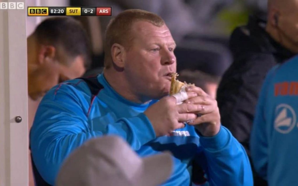 Τη… δόξα έκλεψε ο ευτραφής αναπληρωματικός γκολκίπερ των γηπεδούχων που εθεάθη να τρώει στα τελευταία λεπτά του αγώνα στον πάγκο!