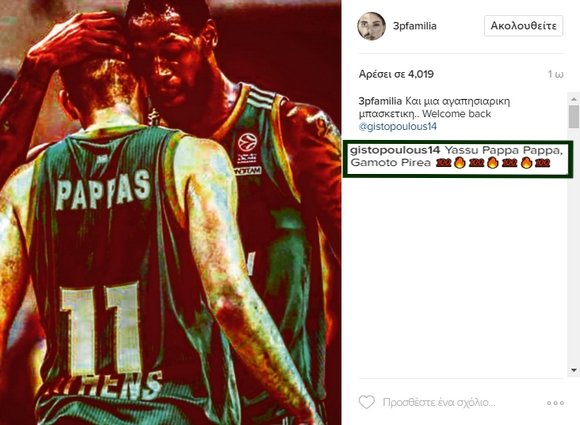 Ο 30χρονος είναι ιδιαίτερα αγαπητός στους συμπαίκτες του και αυτό φάνηκε και μετά τη λήξη του αγώνα. Ο Νίκος Παππάς ανέβασε στο instagram μία φωτογραφία με τους δυο τους και έγραψε το εξής: «Και μια αγαπησιαρικη μπασκετικη.. Welcome back».