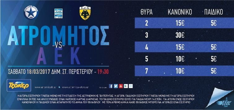 «Το Τμήμα Εισιτηρίων της ΠΑΕ Ατρόμητος ενημερώνει τους φιλάθλους μας ότι η πώληση εισιτηρίων του αγώνα πρωταθλήματος με την ΑΕΚ σήμερα (Παρασκευή 17 Μαρτίου) θα γίνει από τις 12.00 μέχρις τις 20.00 από το Γραφείο Διαχείρισης Εισιτηρίων (Θύρα 2). Αύριο (Σάββατο) η πώληση θα ξεκινήσει απο τις 11.00 από τη Θύρα 2 ενώ από τις 12.00 μέχρι και την έναρξη στις 19.30 θα λειτουργήσουν και τα εκδοτήρια της Θύρας 4. Για την πώληση εισιτηρίου είναι απαραίτητος ο αριθμός Αστυνομικής Ταυτότητας αλλά και ο αριθμός ΑΜΚΑ υπέρ του φιλάθλου του οποίου εκδίδεται».