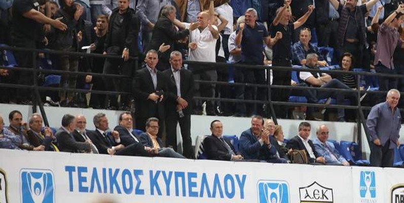 Λίγες θέσεις πιο δίπλα κάθεται και ο πρόεδρος της Ένωσης Κεντρώων Βασίλης Λεβέντης μαζί με τη σύζυγό του. Το παρών στον αγώνα δίνει και ο γ.γ. Αθλητισμου Ιούλιος Συναδινος.
