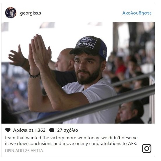 «Η ομάδα που ήθελε περισσότερο τη νίκη σήμερα, κέρδισε. Δεν μας άξιζε. Θα βγάλουμε τα συμπεράσματα μας και θα προχωρήσουμε. Τα συγχαρητήρια μου στην ΑΕΚ», έγραψε χαρακτηριστικά στο Instagram.