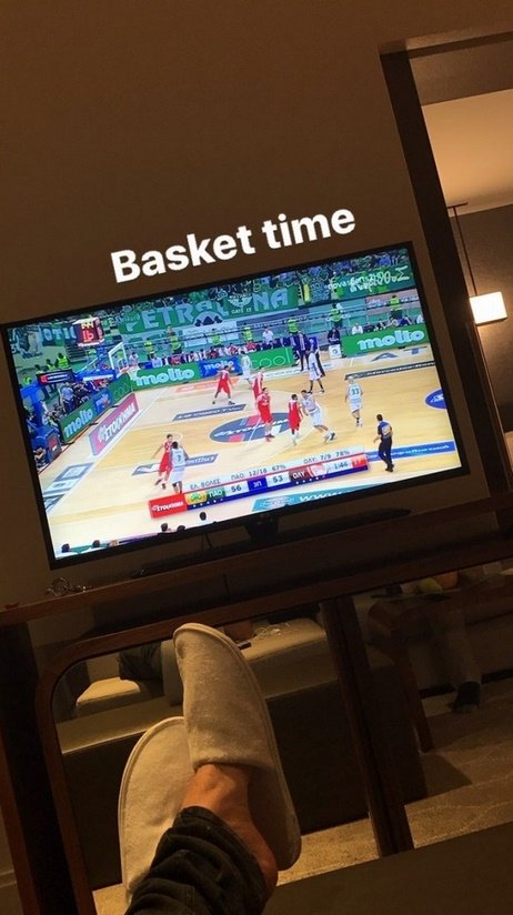 «Basket time», έγραψε χαρακτηριστικά, με τις... παντόφλες του να φαίνονται επίσης στη φωτογραφία που είναι αραχτός στον καναπέ του βλέποντας το ματς.