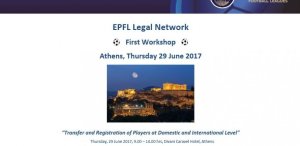 Αναλυτικά η ενημέρωση: «Η πρώτη ημερίδα EPFL Legal Network θα διεξαχθεί στην Αθήνα στις 29 Ιουνίου 2017, σε συνεργασία με τη Super League, στο ξενοδοχείο Divani Caravel.
