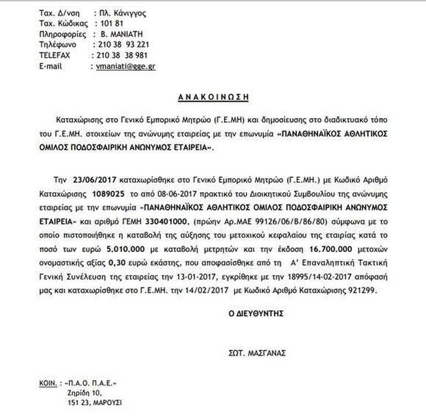 Το Υπουργείο Οικονομίας και ανάπτυξης πιστοποίησε την Αύξηση Μετοχικού Κεφαλαίου κατά 5.000.000 ευρώ στην ΠΑΕ Παναθηναϊκός. Πρόκειται για μία έγκριση που είχε προκύψει από τον περασμένο Ιανουάριο (13/06/2017) και ουσιαστικά ανακοινώθηκε την Παρασκευή (23/06).