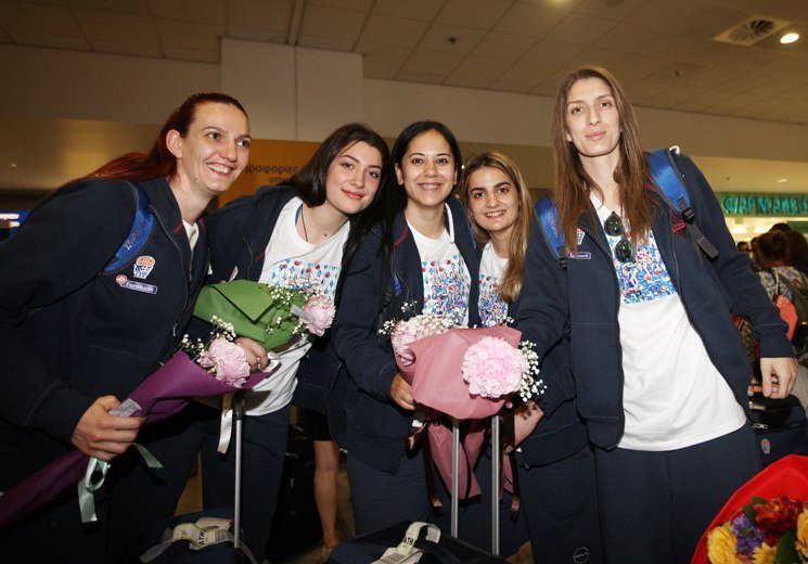 Στην αίθουσα των αφίξεων τον Κώστα Κεραμιδά και τα κορίτσια του υποδέχθηκαν οι Αριστείδης Γολέμης, Κώστας Κώτσης, Δημήτρης Καρβέλας και Γιάννης Αλεξόπουλος, αλλά και υπάλληλοι της ΕΟΚ.