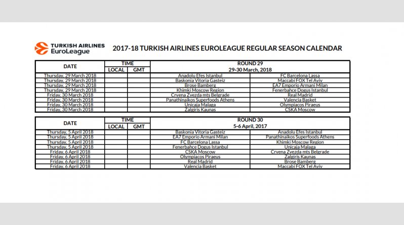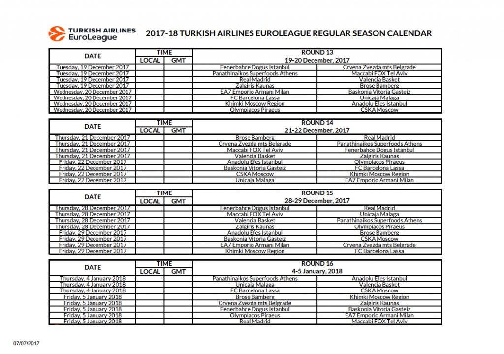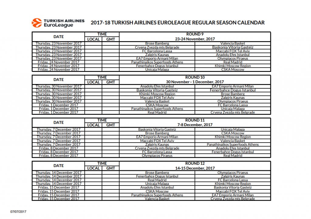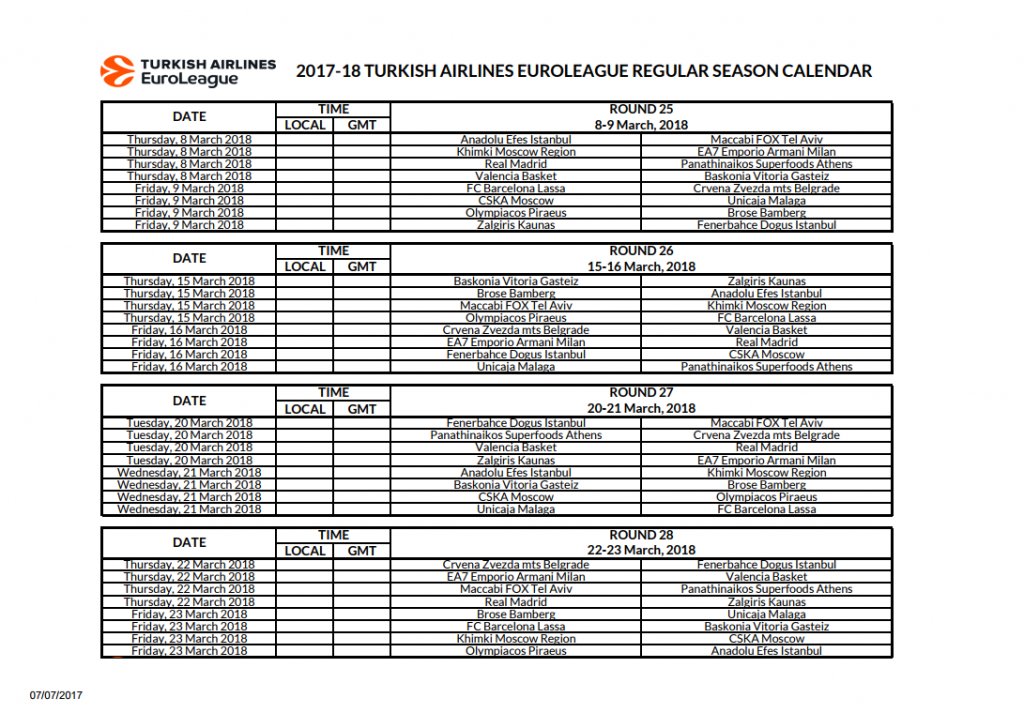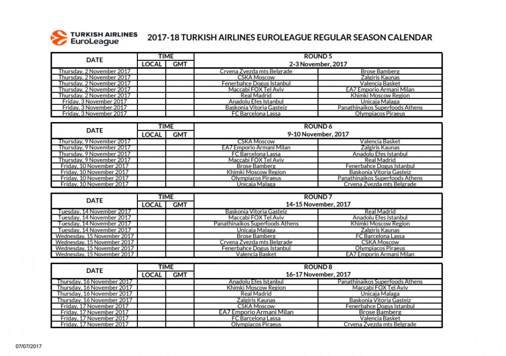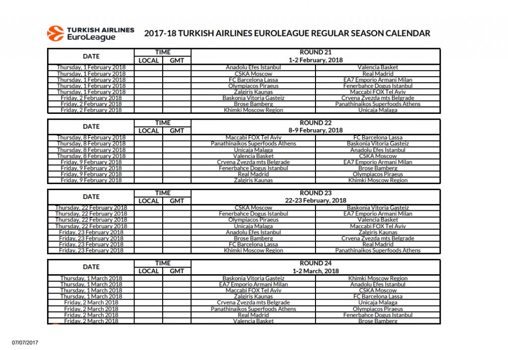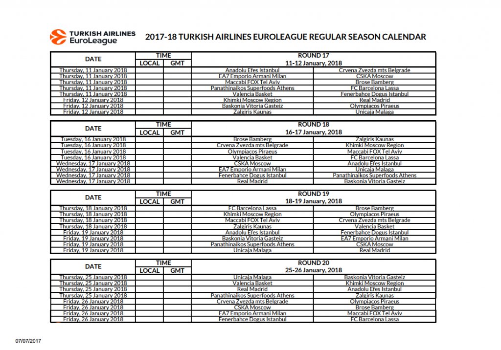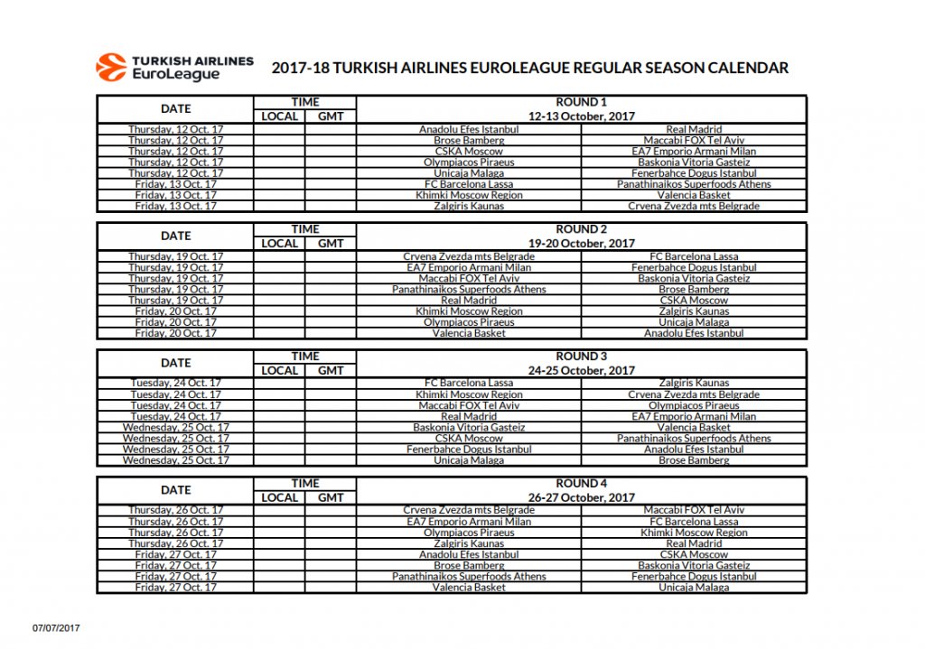 Η διοργανώτρια Αρχή της Ευρωλίγκας κοινοποίησε το πρόγραμμα που αντιστοιχεί στις 30 αγωνιστικές της αγωνιστικής περιόδου 2017-2018, όπως ανακοινώθηκε και επίσημα την Παρασκευή (07/07).