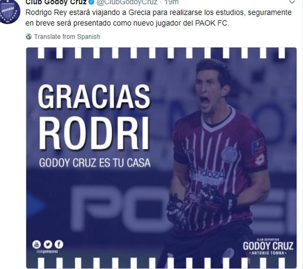 «Ο Ροντρίγκο Ρέι θα ταξιδέψει στην Ελλάδα για να υποβληθεί σε ιατρικές εξετάσεις και να παρουσιαστεί ως νέος ποδοσφαιριστής του ΠΑΟΚ», αναφέρει το σχετικό tweet της αργεντίνικης ομάδας.
