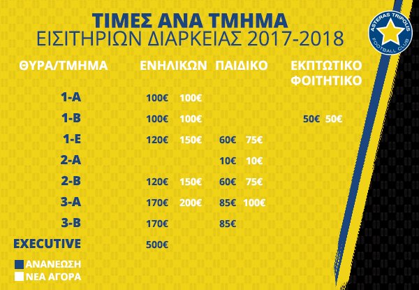 - Στο τμήμα 2-Γ τα εισιτήρια διαρκείας των 100€, διατίθενται για περιορισμένο αριθμό από τους οργανωμένους φιλάθλους του ΑΣΤΕΡΑ.