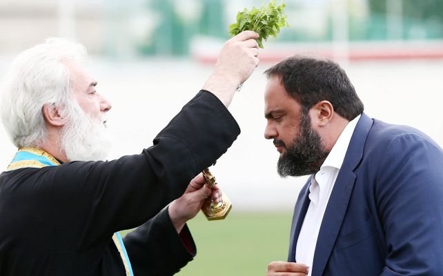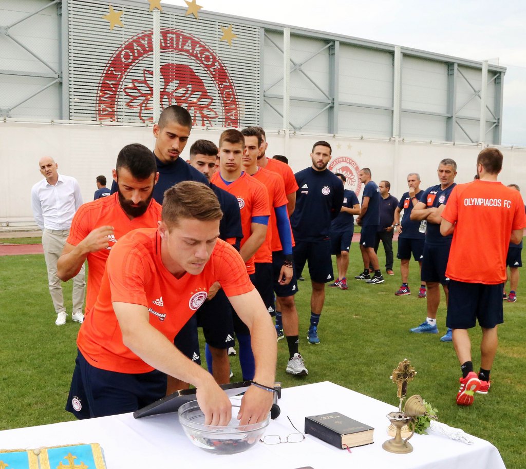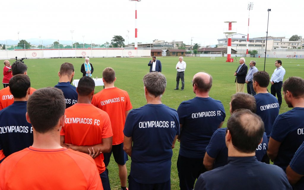 Ο πατέρας Δημήτριος ήταν αυτός που ευλόγησε τους «ερυθρόλευκους», ευχόμενος υγεία και επιτυχίες, αρχής γενομένης από τα ματς του 3ου προκριματικού γύρου του Τσάμπιονς Λιγκ, ενώ το «παρών» στις εγκαταστάσεις του Ρέντη έδωσε και ο πρόεδρος των πρωταθλητών Βαγγέλης Μαρινάκης.