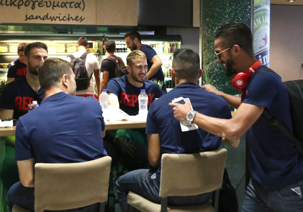 Οι «ερυθρόλευκοι» εμφανίστηκαν χαμογελαστοί και ευδιάθετοι στο «Ελ. Βενιζέλος» και πήραν την πτήση για Βελιγράδι, ελπίζοντας να επιστρέψουν με θετικό αποτέλεσμα.