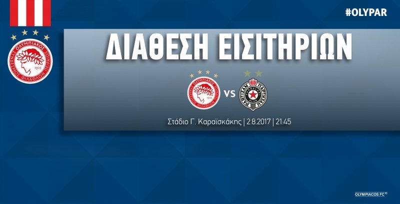 Αναλυτικά η ενημέρωση: «H Π.Α.Ε. ΟΛΥΜΠΙΑΚΟΣ, για τον αγώνα της 3ης Προκριματικής Φάσης του UEFA CHAMPIONS LEAGUE απέναντι στην PARTIZAN που θα διεξαχθεί στο στάδιο "Γ. ΚΑΡΑΪΣΚΑΚΗΣ" την Τετάρτη 2/8/17 και ώρα 21:45, ενημερώνει τους φίλους της ομάδας για τα εξής: