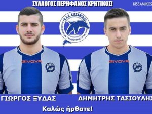 Αναλυτικά η ανακοίνωση: «Η ΠΑΕ Κισσαμικός ανακοινώνει την έναρξη συνεργασίας με τους ποδοσφαιριστές Γιώργο Ξύδα και Δημήτρη Τασιούλη, με τη μορφή δανεισμού από την ΠΑΕ Ολυμπιακός.