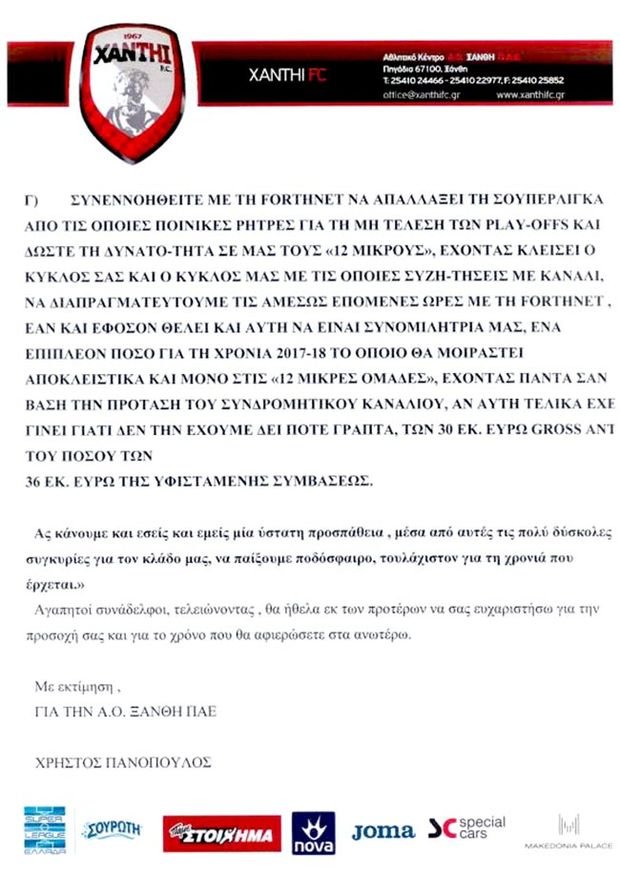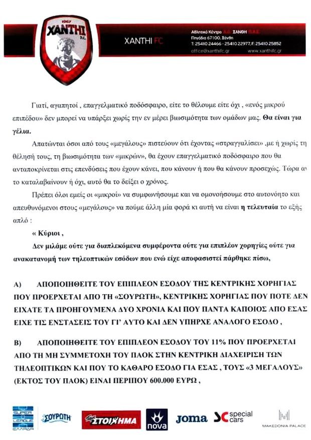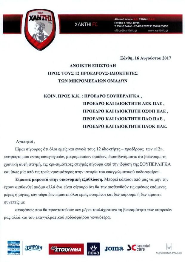 Η επιστολή δημοσιοποιήθηκε στην ιστοσελίδα της Ξάνθης την Τετάρτη (16/8) και απευθύνεται στους μικρομεσαίους. Ωστόσο, έχει κοινοποιηθεί και στους τέσσερις μεγάλους, αφού τους αφορά εξίσου.