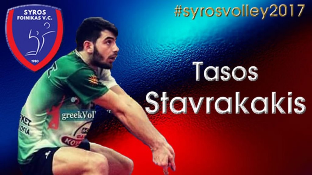 Αναλυτικά η ανακοίνωση: «Το Τ.Α.Α. Α.Ο. Φοίνικας Σύρου βρίσκεται στην ευχάριστη θέση να ανακοινώσει ,την απόκτηση του Τάσου Σταυρακάκη για την αγωνιστική χρονιά 2017-2018.Ο 21χρονος Ακραίος/Λίμπερο έχει γεννηθεί την 12/7/1996 ,έχει ύψος 1.87m,και έχει αγωνιστεί στον Ηρακλή Θεσσαλονίκης 2011-2014 και την Ελπίδα Αμπελοκήπων 2014-2017.Επίσης είναι διεθνής με την U21 Εθνική ομάδα.