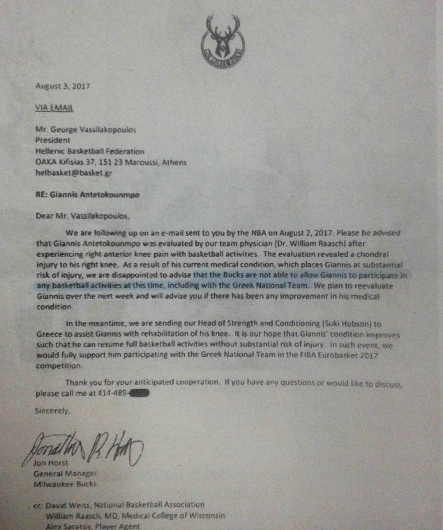 Ο νέος τζένεραλ μάνατζερ των Μπακς, Τζον Χορστ, αναφέρει συγκεκριμένα σε επιστολή που φέρνει στο φως της δημοσιότητας το «Πρώτο Θέμα» και κοινοποιείται στον αντιπρόεδρο του ΝΒΑ, Ντέιβιντ Βάις, στον γιατρό των Μπακς, Γουίλιαμ Ράας, και στον μάνατζερ του Αντετοκούνμπο, Άλεξ Σαράτση, : «Αγαπητέ κύριε Βασιλακόπουλε, παρακαλώ δείτε την επισυναπτόμενη επιστολή από τους Μιλγουόκι Μπακς σχετικά με τον Γιάννη και τη συμμετοχή του στην Εθνική ομάδα. Σύμφωνα με την επισυναπτόμενη επιστολή, και ελπίζοντας σε ένα τηλεφώνημα μεταξύ των δυο μας, δεν επιτρέπεται στον Γιάννη να συμμετάσχει με την Εθνική ομάδα μέχρι να ενημερωθείτε περαιτέρω από εμάς