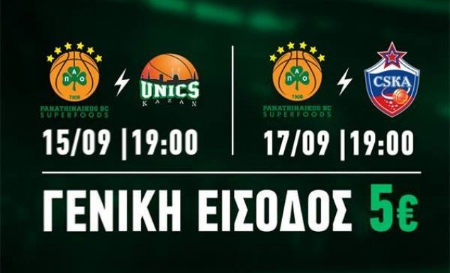 Αναλυτικά η ανακοίνωση: «Η ΚΑΕ Παναθηναϊκός Superfoods σας ενημερώνει πως τέθηκαν σε κυκλοφορία τα εισιτήρια για τους φιλικούς αγώνες με αντιπάλους την Ούνικς Καζάν (15/9, 19.00) και την ΤΣΣΚΑ Μόσχας (17/9, 19.00) στο ΟΑΚΑ με γενική είσοδο 5 ευρώ ανά παιχνίδι!