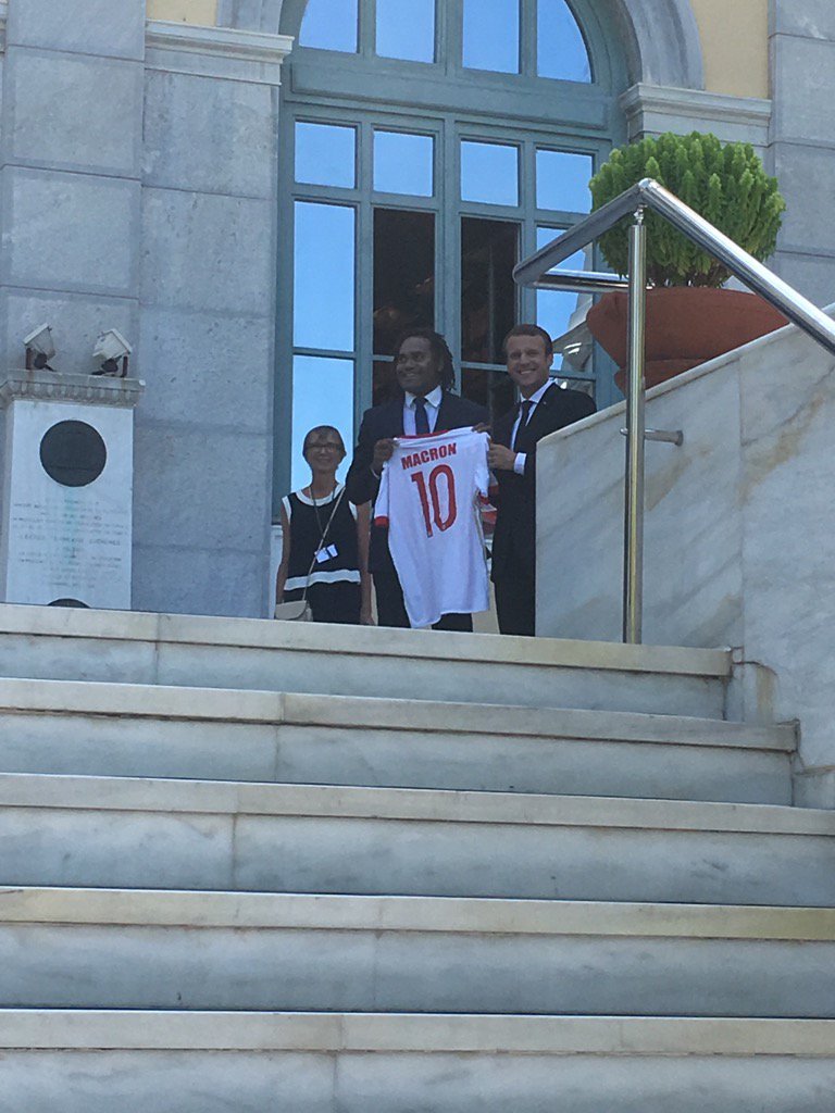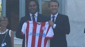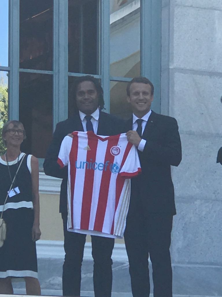 Όπως είθισται κάθε καλεσμένος όταν προσκαλείται σε μια εκδήλωση έχει μαζί του ένα δώρο, με τον Καρεμπέ να δίνει στον Γάλλο πρόεδρο μια φανέλα του Ολυμπιακού.