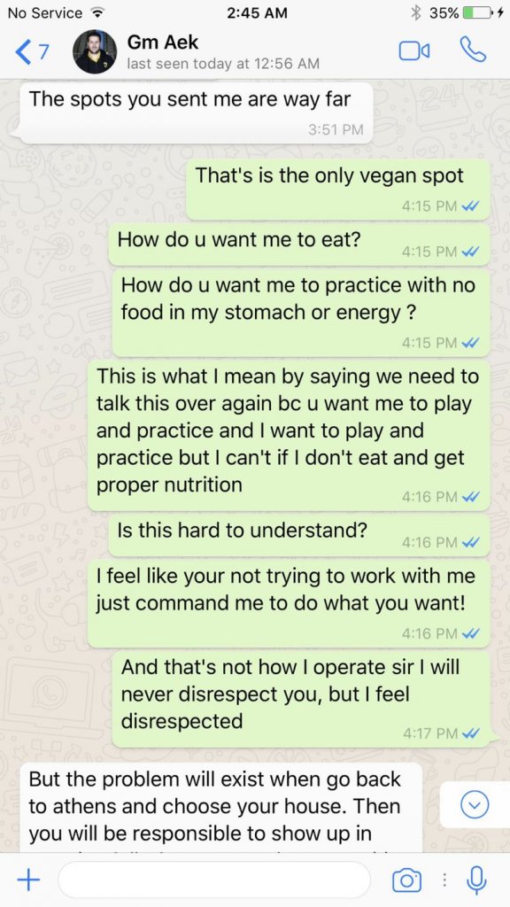 Σε αυτόν ξεσπά όταν του επισημαίνεται ότι το μέρος είναι μακριά και θα πρέπει να επιστρέψει έγκαιρα για την προπόνηση, σημειώνοντας μεταξύ άλλων ότι νιώθει να μην τον σέβονται και ότι δεν τρώει καλά, με αποτέλεσμα να έχει χάσει κιλά από όταν ήρθε στην ομάδα.