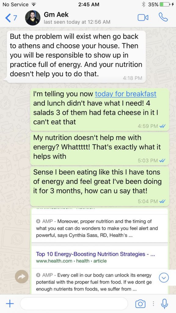 Σημειώνει ότι θα πρέπει να κάτσουν να συζητήσουν για το θέμα και θέτει ακόμα και θέμα αποχώρησής του, όταν ο τιμ μάνατζερ του εξηγεί ότι η συγκεκριμένη διατροφή θα επηρεάσει την απόδοσή του.