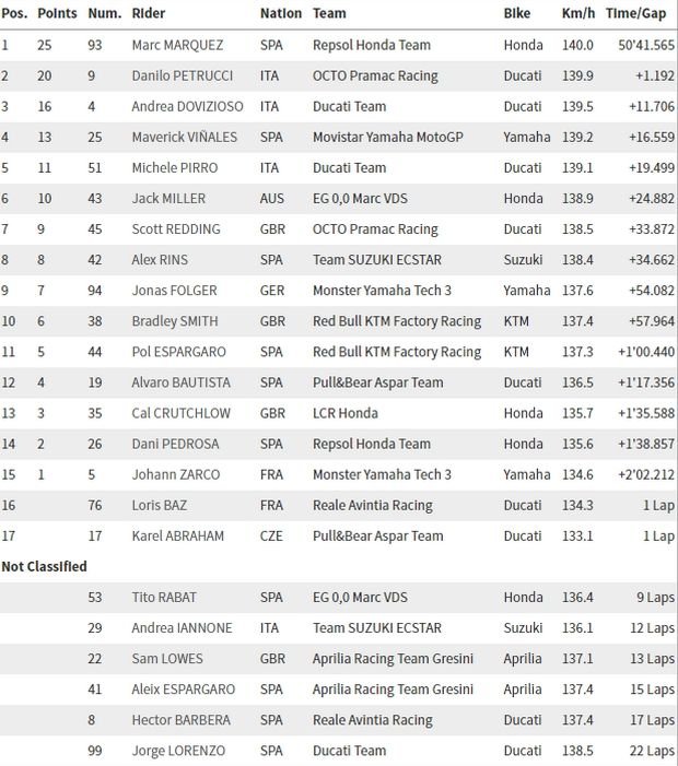Ο πρωτοπόρος έχασε έδαφος αμέσως μετά με τους Πετρούτσι και Μάρκες να μάχονται, αλλά ο Ισπανός έκανε τη δική του επίθεση στην πρώτη στροφή του τελευταίου γύρου πανηγυρίζοντας σπουδαία νίκη. Παράλληλα, αναζοπύρωσε τις πιθανότητες κατάκτησης του τέταρτου τίτλου και δεύτερου συνεχόμενου.
