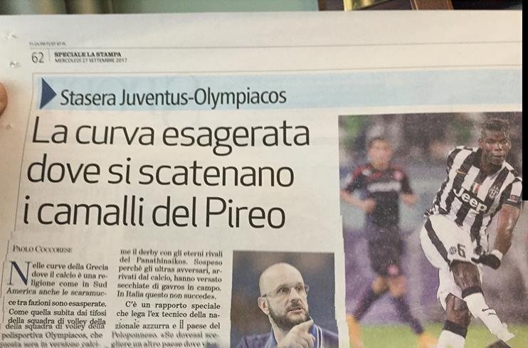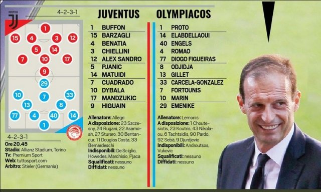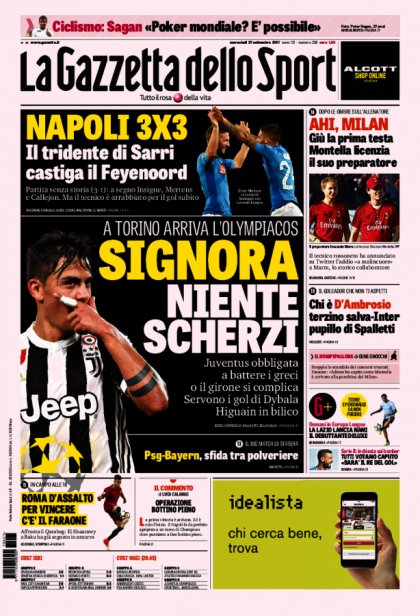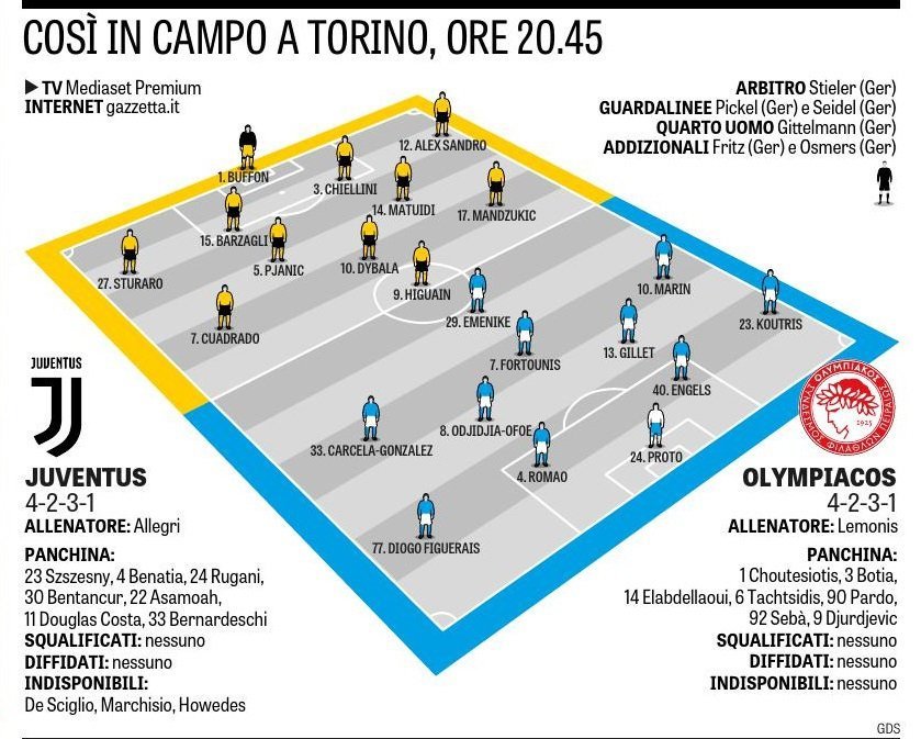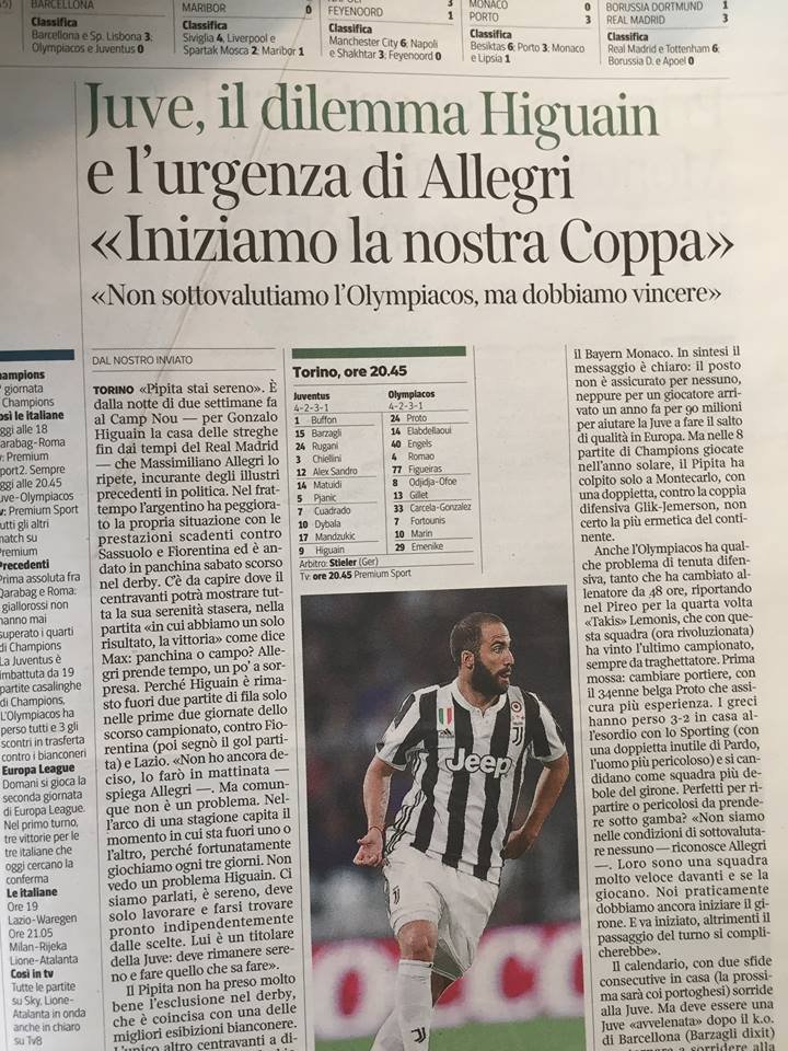 Gazzetta dello Sport: «Ο Ολυμπιακός έχει φτάσει στο Τορίνο. Η Κυρία δεν αστειεύεται. Η Γιουβέντους πρέπει να κερδίσει τους Έλληνες για να μην περιπλεχτούν τα πράγματα στον όμιλο. Οι υπόλοιποι θα σερβίρουν τους Ντιμπάλα και Ιγκουαΐν».