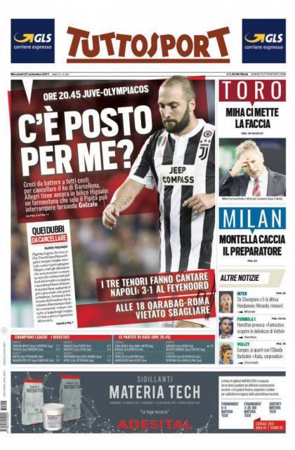 Tuttosport: «Υπάρχει χώρος γαι μένα; Οι Έλληνες πρέπει να νικηθούν με κάθε κόστος για να "ακυρωθεί" η ήττα από την Μπαρτσελόνα. Ο Αλέγκρι κρατά σε ισορροπία τον Ιγκουαΐν: μία ιστορία που μόνο ο "Πιπίτα" μπορεί να σταματήσει εάν γίνει και πάλι ο Γκονσάλο».