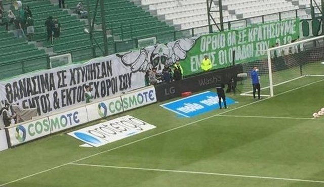 Πριν την έναρξη του αγώνα το πανό που σηκώθηκε στη Θύρα 13 ανέφερε «Θανάσιμα σε χτύπησαν οι εντός & εκτός εχθροί σου, όρθιοι θα σε κρατήσουμε εμείς οι οπαδοί σου», ενώ στο ημίχρονο αναρτήθηκε το ακόλουθο: «Δεν θα μας τελειώσεις εσύ, θα σε τελειώσουμε εμείς».