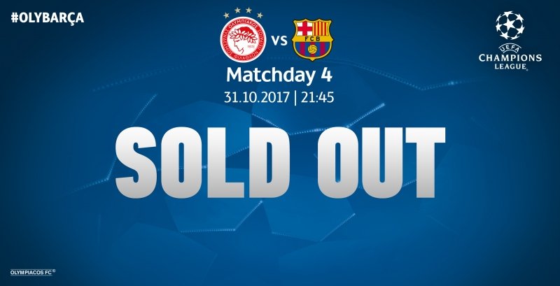 Αναλυτικά: «Η ΠΑΕ Ολυμπιακός ανακοινώνει την εξάντληση των εισιτηρίων για την 4η αγωνιστική του εφετινού UEFA Champions League και τον αγώνα με αντίπαλο την Μπαρτσελόνα, στο γήπεδο Καραϊσκάκη».