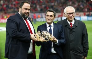 Συγκίνηση, αναγνώριση τιμή… Ο Ερνέστο Βαλβέρδε βραβεύεται, εν μέσω αποθέωσης από το κατάμεστο «Γ. Καραϊσκάκης», από τον πρόεδρο του Ολυμπιακού Βαγγέλη Μαρινάκη λίγο πριν από την εναρκτήρια σέντρα της αναμέτρησης για την 4η αγωνιστική του Τσάμπιονς Λιγκ των πρωταθλητών Ελλάδας με την Μπαρτσελόνα.