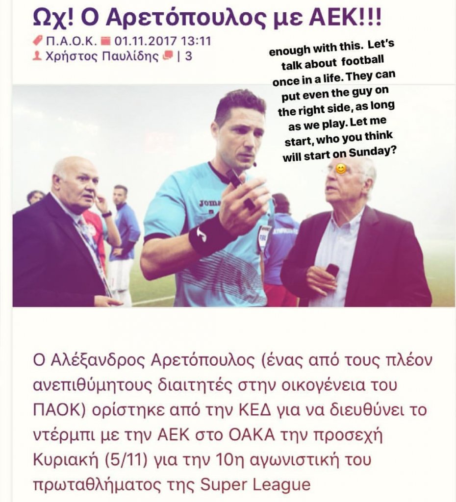 Από τη Θεσσαλονίκη υπήρξε αντίδραση για τον συγκεκριμένο διαιτητή, όμως, ο Γιώργος Σαββίδης προσπάθησε γρήγορα να καλμάρει τις αντιδράσεις ζητώντας να εστιάσουν όλοι στο ποδόσφαιρο. Ανέβασε, μάλιστα, μία φωτογραφία στην οποία ο Αρετόπουλος είναι στο «Γ. Καραϊσκάκης» και δίπλα του έχει τον Σάββα Θεοδωρίδη.