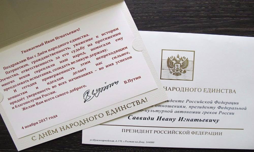 Και σήμερα η προσήλωση σε αυτές τις διαχρονικές αξίες και τα ιδανικά, μάς κάνει πιο ισχυρούς, μάς δίνει τη βεβαιότητα σε κάθε καινούρια αρχή για την επίτευξη ευημερίας και επιτυχιών στη Ρωσία. Σας εύχομαι ό,τι καλύτερο. 4 Νοεμβρίου, 2017 Βλαντιμίρ Πούτιν
