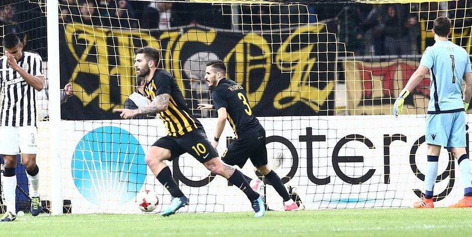 Ψυχωμένη η ΑΕΚ νίκησε δίκαια τους Θεσσαλονικείς με 1-0 σε ένα κακό ματς στο ΟΑΚΑ και έφτασε τον Ατρόμητο στην κορυφή * Μόνο… ξύλο και τσαμπουκάδες οι «ασπρόμαυροι» * Τρεις κόκκινες * Με παίκτη λιγότερο από το 8’ οι «κιτρινόμαυροι» (Αραούχο), αριθμητική ισορροπία στο 35’ (Ζαμπράνο) και τους φιλοξενούμενους να μένουν με εννέα στις καθυστερήσεις (Μπίσεσβαρ)