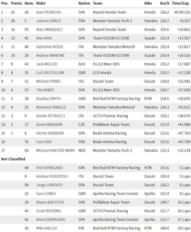 Ο ίδιος είχε βγει νωρίτερα σώζοντας την πτώση με εντυπωσιακό τρόπο μολονότι βρέθηκε πίσω από τον Ιταλό και άμεσο ανταγωνιστή του. Όσον αφορά το νικητή ήταν ο έτερος αναβάτης της Repsol Honda, Ντάνι Πεντρόθα που έμεινε μπροστά από τον Γιόχαν Ζάρκο της Monster Yamaha Tech 3 παρά την πίεση του Γάλλου.