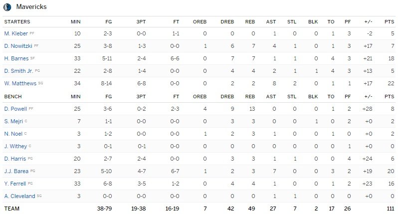 Αντιθέτως, το Ντάλας διέθετε πλουραλισμό στην επίθεση. Ο Μάθιους πέτυχε 22 πόντους συνεπικουρούμενος από τους Μπαρέα (20π.) και Μπαρνς (18π.).